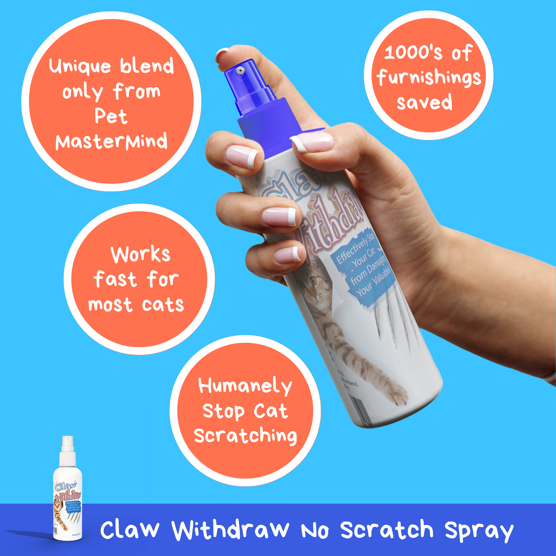đââŹEffective Cat Scratch Deterrent - Select Claw Withdraw as itâs the standard in cat deterrent sprays. Safe for both cats and humans, Claw Withdraw Anti Cat Scratch Spray is plant-based, gentle, and formulated to be effective for a majority of cats. An added bonus is that this bottle smells good to us humans.